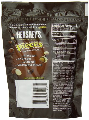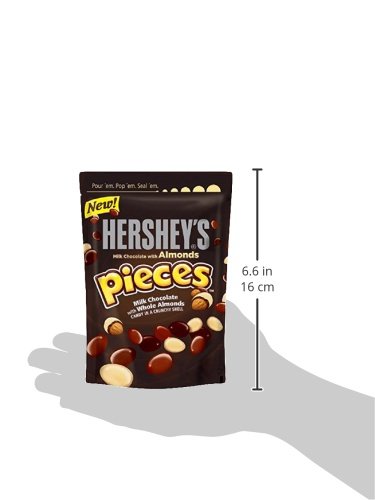 -. Feature : Open up a world of deliciousness with an 8-ounce bag of HERSHEY'S PIECES Candies with the taste of milk chocolate with whole almonds. / Treat yourself to delicious whole almonds enrobed in smooth HERSHEY'S Milk Chocolate with a classic, crunchy candy shell. / This new, nutty candy is the perfect movie snack or ice cream sundae topping. / Great for sharing and snacking, these candies come in portable pouch with resealable opening. Sweeten up any day at home, school, or the workplace with HERSHEY'S brand chocolate candies. / This product ships as an 8-ounce pouch.