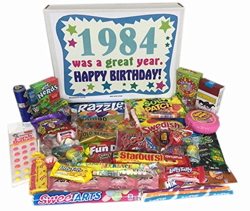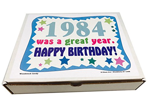 -. Binding : Misc. -. Brand : Woodstock Candy -. Feature : Makes a fun and unique 33rd birthday gift for someone born in 1984 / Perfect for the person who has everything / Everyone loves candy from their childhood / Box reads "1984 was a great year. Happy Birthday!" / Comes shrink wrapped in a box that measures 11.75" x 9" x 2" -. IsAdultProduct : 0 -. Label : Woodstock Candy -. Manufacturer : Woodstock Candy -. PackageQuantity : 1 -. ProductGroup : Grocery -. ProductTypeName : GROCERY -. Publisher : Woodstock Candy -. Studio : Woodstock Candy -. Title : 1984 33rd Birthday Gift Box of Retro Nostalgic Candy from Childhood for Men and Women