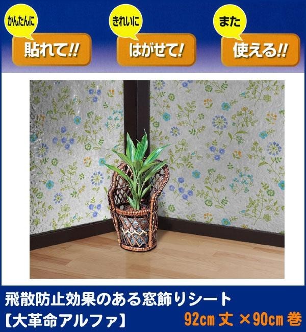 | 簡単に貼ってはがせて、飛散防止効果でもしもの時も安心な窓飾りシート「大革命アルファ」。粘着剤を使用していないので何度でも貼りなおしでき、はがした後も糊残りの心配がありません。シートを全面に貼ることで、割れたガラスが飛び散りにくくなります。 |