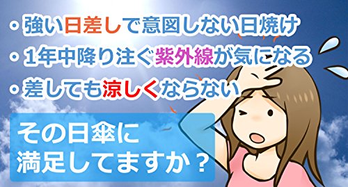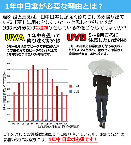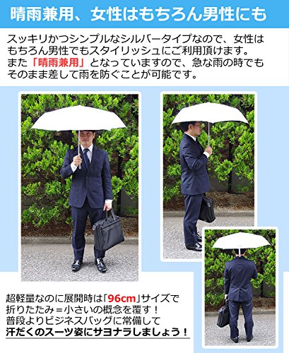 -. Feature : 【安心の日本検査機関確認済!】日傘で紫外線からお肌を守る大事な「UVカット」の性能は日本の検査機関にて「UVカット率99.9% UPF50+」確認済み! / 【持ち運びラクラク、軽量折りたたみ日傘!】 軽量にこだわった折りたたみ日傘なので、日差しの強くなりそうな日にはバックの中などに入れておいても気になりません。 / 【しっかり遮光・遮熱】 表面はシルバーコーティングで太陽光を反射して、太陽光による直接的な暑さを減少させ、内側の黒生地では遮光効果により太陽光による直接の照りつけをカット! / 【晴雨兼用なので突然の雨でも安心!】 晴雨兼用傘なので、突然の雨でもそのまま普通の傘と同じくご利用頂けます。 / 【製品仕様】 ・長さ:「収納時」約26cm 「使用時」約57cm(柄部分含む) ・柄部分の長さ:約4cm ・親骨:約54cm ・展開時の直径サイズ:約96cm ・重さ:約180グラム ・生地:ナイロン 100% ・UV遮蔽率 99.9% ・UPF UPF50+