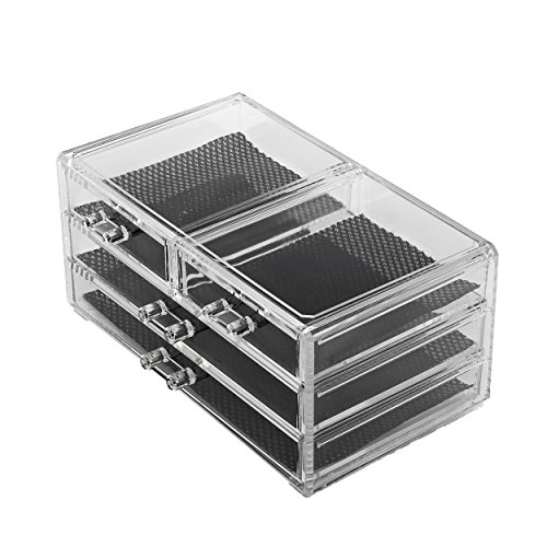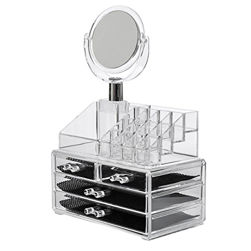 Acrylic Makeup Organizer 4 Drawers with Removable Mirorr Cosmetic Organizers Jewelry and Cosmetic Storage Grid Holders Display Box Colorless Two Piece Set with Removable Black Mesh Padding by Intriom