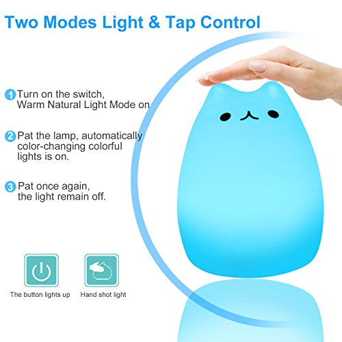 - [ Built-in Battery ]: Built-in 1200mAH lithium battery, It takes about 3 hours to be charged fully by micro usb and can be used up to 15 hours. The base and silicone cat can be detachable that the silicone cat can be washed when it's dirty. Notice: Please look after the child when he plays with light alone.