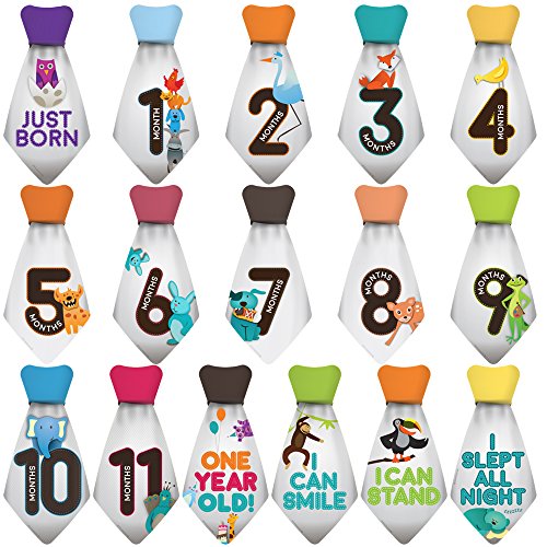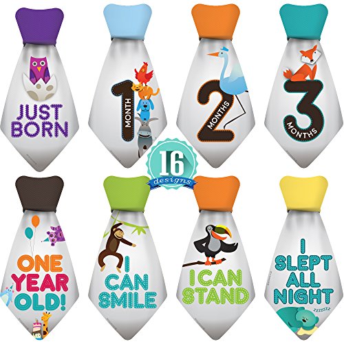 Original Stick'Nsnap (TM) 16 Baby Monthly Necktie Onesie Stickers - “Happy Animals” (TM), Gray. Milestones for 12 Months +4 Bonus Milestones - Best Baby...
