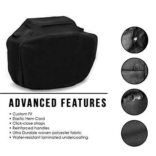 DURABLE COVER WITH ADVANCED FEATURES: Click-close straps snap over wheels/legs to secure cover on the windiest days Reinforced handles make removal easy while double-stitched seams add strength and a stylish accent