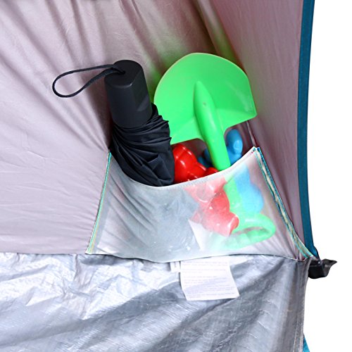 Includes assembly instruction, sand pockets, 4 wind ropes,8 steel stakes for beach, backyard, parks or picnics use.4 corner pockets for keeping your things in place.