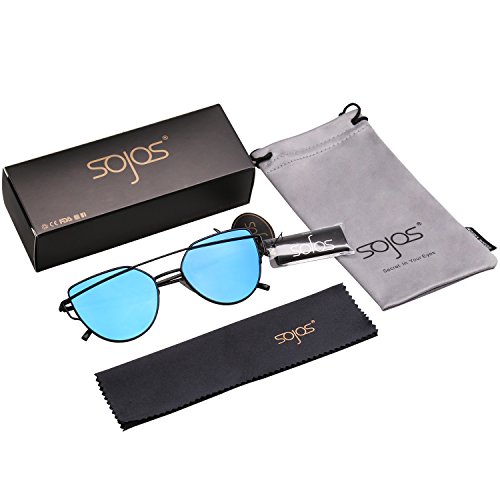 SojoS Cat Eye Mirrored Flat Lenses Street Fashion Metal Frame Women Sunglasses SJ1001 With Black Frame/Blue Mirrored Lens