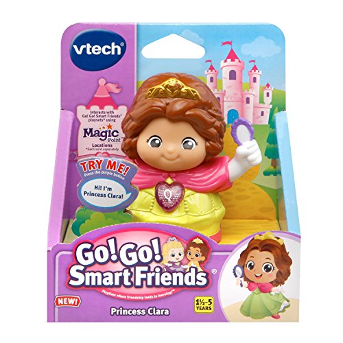 Princess Clara from the VTech Go! Go! Smart Friends world loves to travel around the kingdom! Press her light-up button and she will come to life by introducing herself, talking about what it’s like to live in a kingdom and singing songs. Explore the realm by placing Princess Clara on MagicPoint locations on Go! Go! Smart Friends playsets (each sold separately) to trigger different phrases, motion, lights and more. Each Go! Go! Smart Friends character is unique. Collect them all to create a whole kingdom featuring princesses, princes, magical creatures and more. Requires 2 AAA batteries (batteries included for demo purposes only; new batteries recommended for regular use). Intended for ages 18 months to 5 years.Feature