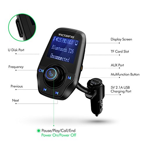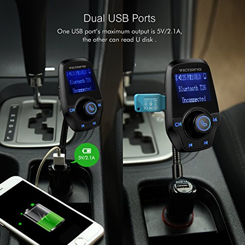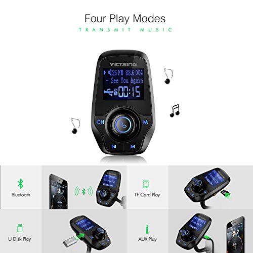 - 2017 New Model with 4 Play Modes: The FM transmitter can play music from Bluetooth-enabled device to car stereo via FM signal. It can stream music from TF card or U disk with a capacity of up to 32G. Additionally, it can transmit music from your MP3 player, old speaker and tablet to the car stereo system via the provided 3.5mm audio cable.