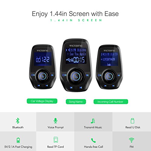 - Large LCD Display Screen. 1.44in LCD display screen clearly shows your car voltage when plugged in, phone number for incoming call and song name when stream music from U disk or TF card.