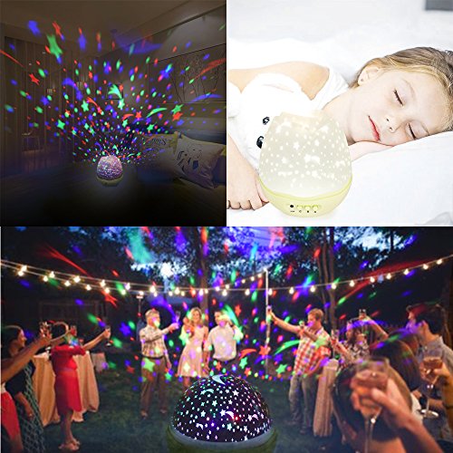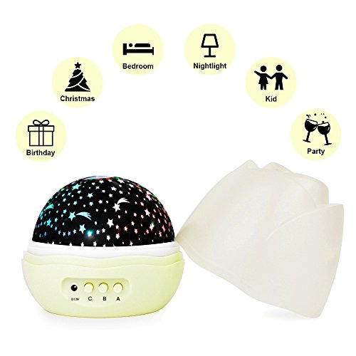 - Intelligent Control --- 1.A mode: only the warm light, suitable for sleeping at night as a normal lamp 2.B mode: Switch the light-colored (monochrome light or colorful light overlay), used to project the star. 3.C mode: Rotation control, used with B mode, suitable for birthday party or the bar.