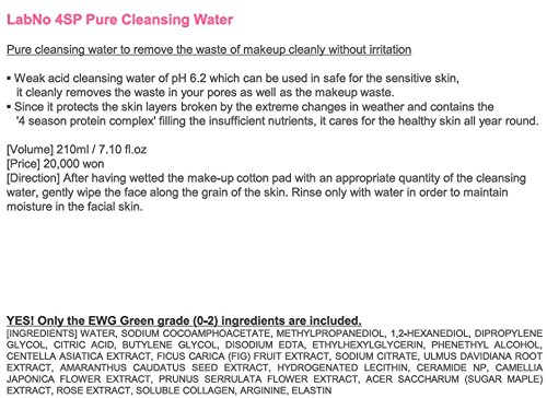 -. Binding : Misc. -. Brand : LabNo -. EAN : 8806822000608 -. Feature : Weak acid cleansing water of PH6.2 which can be used in safe for the sensitive skin, it cleanly removes the waste in your pores as well as the makeup waste. / Only the EWG Green grade(0-2) ingredients are included / Pure cleansing water to remove the waste of makeup cleanly / For a healthy skin across all four seasons (4 SEASON PROTEIN COMPLEX) / A customized prescription for skin troubles due to seasonal changes from sP.R.Ing, summer, autumn to winter! Intensive care with a protein complex all year long! -. IsAdultProduct : 0 -. Label : LabNo -. Manufacturer : LabNo -. MPN : ryyk -. PartNumber : ryyk -. ProductGroup : Beauty -. ProductTypeName : BEAUTY -. Publisher : LabNo -. Studio : LabNo -. Title : [LabNo] 4SP Pure Cleansing Water (210milliliter)