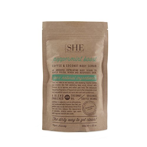 OM SHE Aromatherapy's Coffee & Coconut body scrub blends organic coffee, coconut shell, organic rosehip, almond & essential oils to cleanse & rejuvenate your skin.