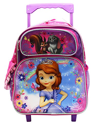-. Brand : Disney -. ClothingSize : Small -. Color : purple -. Department : girls -. EAN : 0875598654337 -. Feature : Sofia the first rolling backpack / Small size children's backpack / Also can be used as a carry backpack / Includes a mesh and velcro cover side pouch / Measures 12in (30.5cm) tall, 10in (25.5cm) wide, and 5in (12.5cm) deep -. Label : Accessory Innovations -. Manufacturer : Accessory Innovations -. Model : 05433 -. MPN : 654337 -. NumberOfItems : 12 -. PackageQuantity : 1 -. PartNumber : 654337 -. ProductGroup : Apparel -. ProductTypeName : APPAREL -. Publisher : Accessory Innovations -. Size : Small -. Studio : Accessory Innovations -. Title : Disney Junior Sofia the First Small Rolling Backpack -. UPC : 875598654337