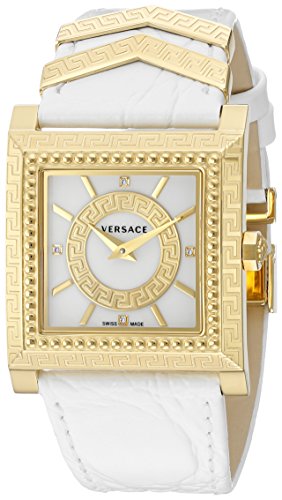 Gold-tone stainless steel case with a white leather strap. Fixed gold-tone bezel. White dial with gold-tone hands and index hour markers. Diamonds set at the 3, 6, 9 and 12 o'clock positions. Dial type: analog. Quartz movement. Scratch resistant sapphire crystal. Pull / push crown. Solid case back. Case size: 30 mm. Case thickness: 8 mm. Square case shape. Band width: 18 mm. Deployment clasp. Water resistant at 30 meters / 100 feet. Functions: hour, minute. Dress watch style. Watch label: swiss made. Versace dv-25 white dial white leather ladies watch vqf010015.