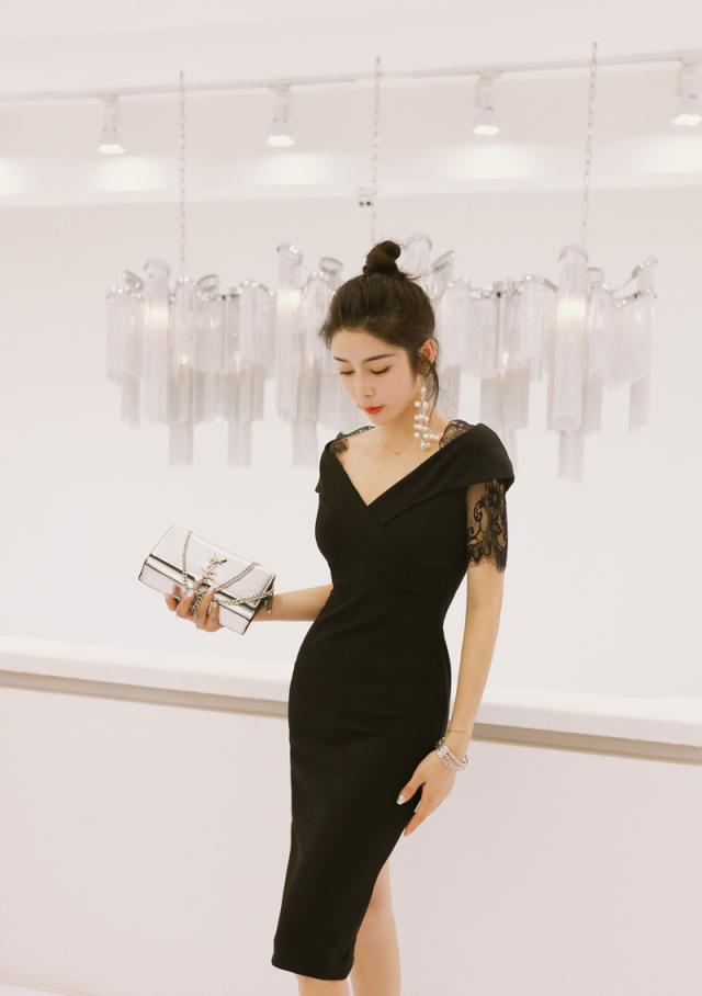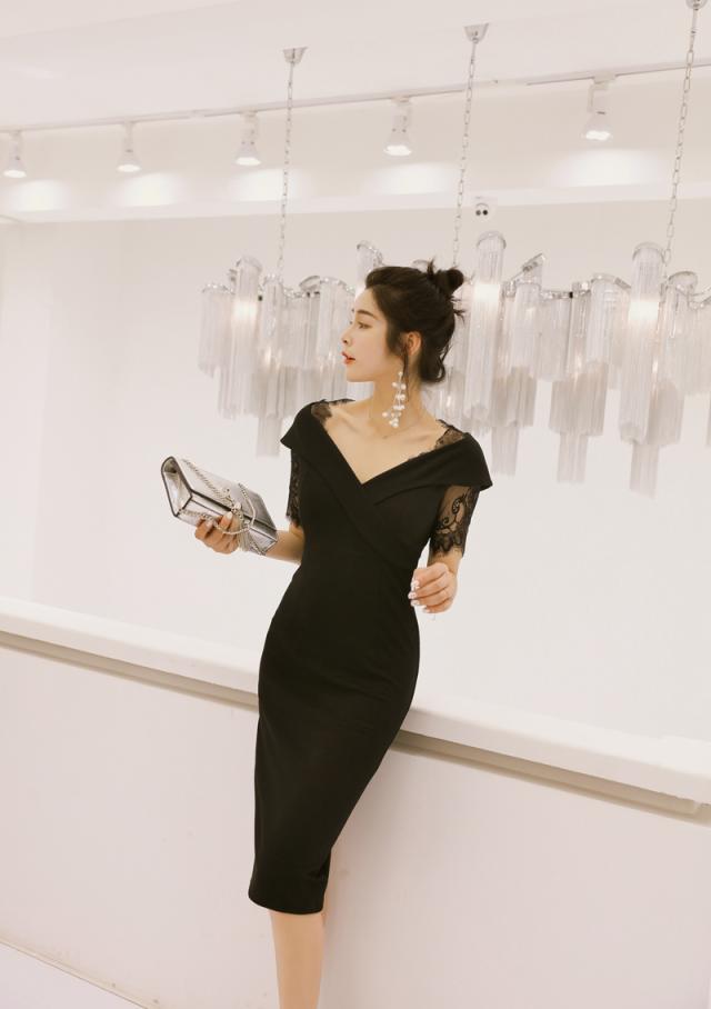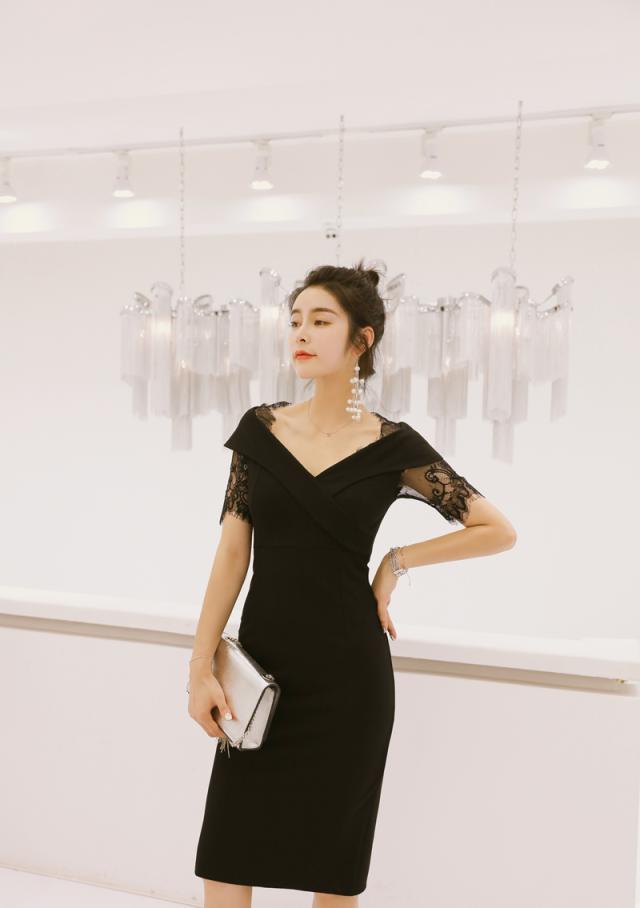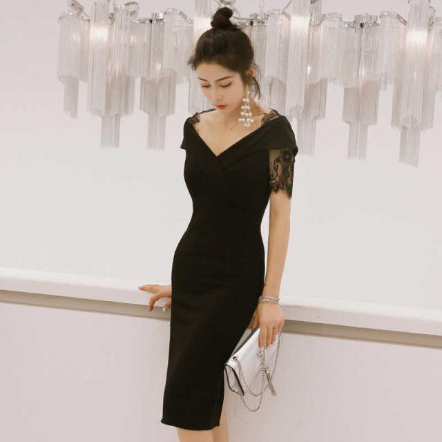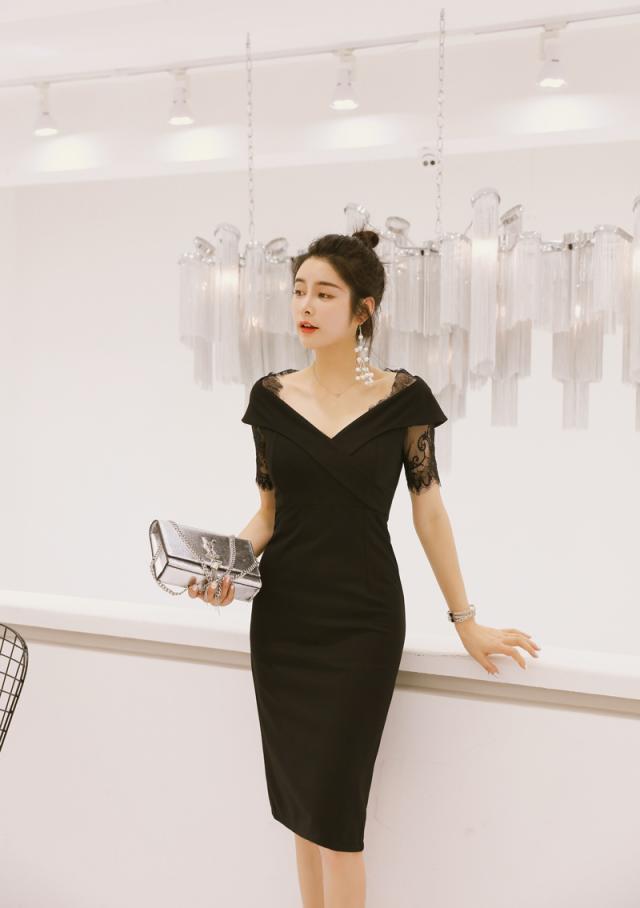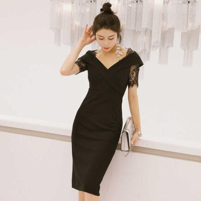 花柄 タイト Vネック レース 無地 パーティードレス