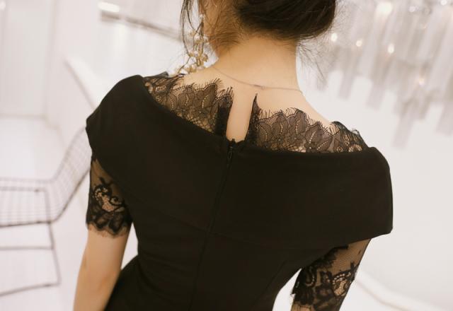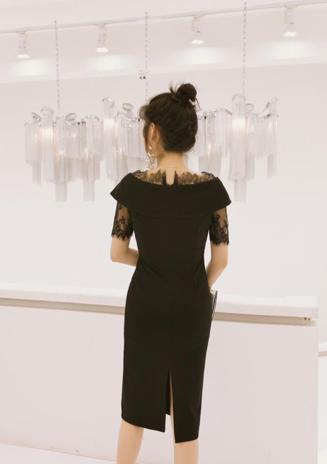 膝丈レース切替異素材パーティーワンピースです。