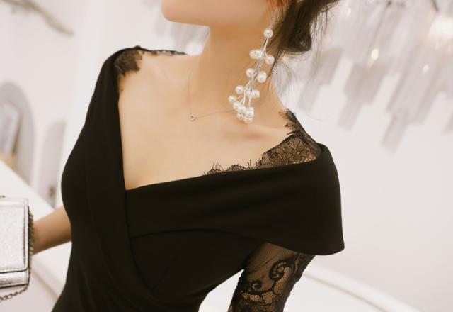 レース異素材MIXデザインがエレガント スリムに見せてくれる。