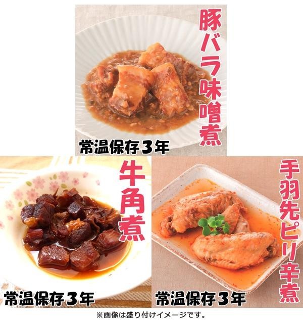| セット内容 | LL豚バラ味噌煮(100g)×3袋 LL牛角煮(100g)×3袋 LL手羽先ピリ辛煮(150g)×3袋 |