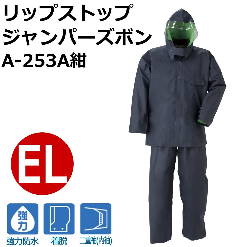 フードは取り外しが可能です。二重構造の袖口で、雨水の侵入をしっかりと防ぎます。 製造国:中国 素材・材質:ナイロンからみ織両面ビニール セット内容:ジャケット、パンツ ※サプライヤー直送品 ご注文後3~4営業日後の出荷となります【商品名】スミクラ リップストップ ジャンパーズボン A-253A紺 EL