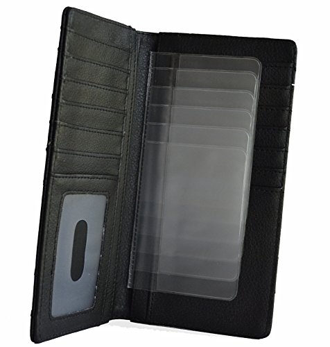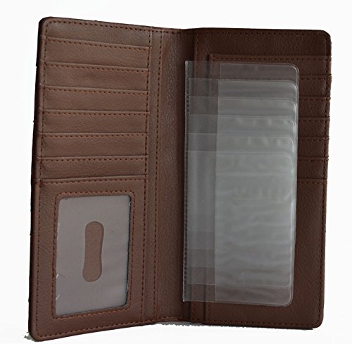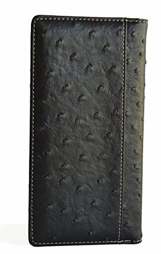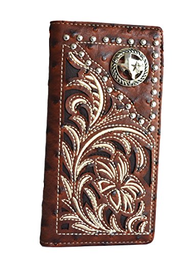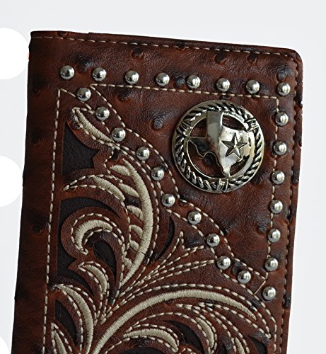 -. Feature : Faux leather ostrich P.R.Int cut out western stitched design on front / Front silver tone Texas state map concho, contrasting inlay laser cut design, studs accent on front / 12 credit card slots, removable 6 clear credit cards holder, 1 clear ID, 3 compartments for currency or receipts, Back slip pocket / Checkbook slit / Measurements: 7" x 3.5"