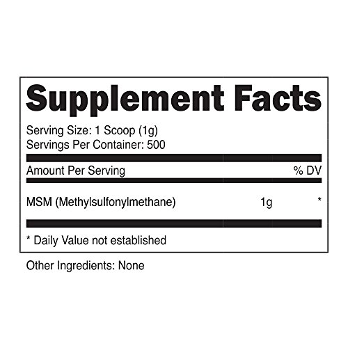 -. Binding : Health and Beauty -. Brand : Nutricost -. Feature : Lab Tested High Quality MSM Powder / 500 Grams Per Bottle / Serving Size: 1 Scoop (1g) (Included) / Non-GMO, Gluten Free / Made in the USA -. IsAdultProduct : 0 -. Label : Nutricost -. LegalDisclaimer : These statements have not been evaluated by the Food and Drug Administration. This product is not intended to diagnose, treat, cure, or prevent any disease. -. Manufacturer : Nutricost -. ProductGroup : Health and Beauty -. ProductTypeName : HEALTH_PERSONAL_CARE -. Publisher : Nutricost -. Studio : Nutricost -. Title : Nutricost Pure MSM (Methylsulfonylmethane) Powder