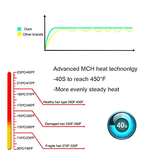 - Flat iron with smooth and ceramic plates, MCH technology makes the straightener heat up fast (40 second) and evenly to avoid hot spots that can damage hair, straightening your hair silky and shiny without worry of added damage.