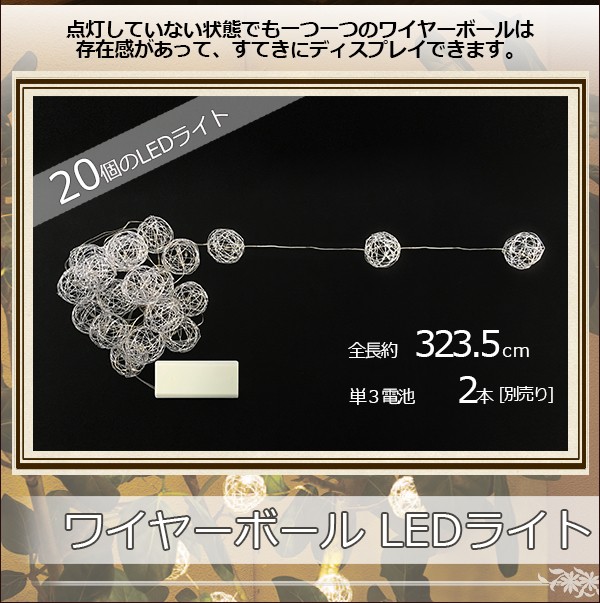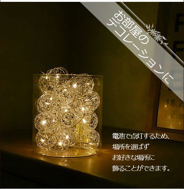 | やわらかな光で、おしゃれにお部屋を演出してくれるワイヤーボールLEDライト。イベントシーズンのイルミネーションとして、または普段のインテリアのデコレーションとしてもお使いいただけます。点灯していない状態でも、1つ1つのワイヤーボールは存在感があり、アイデア次第で使い方は様々。単3電池2本で点灯するため、場所を選ばず飾ることができます。またLEDですので、熱くならず安心してお使いいただけます。ワイヤーボール/ガーランドライト/LED/イルミネーション/ライト/電池/おしゃれ/クリスマス/デコレーション/ライトアップ/エレガント |