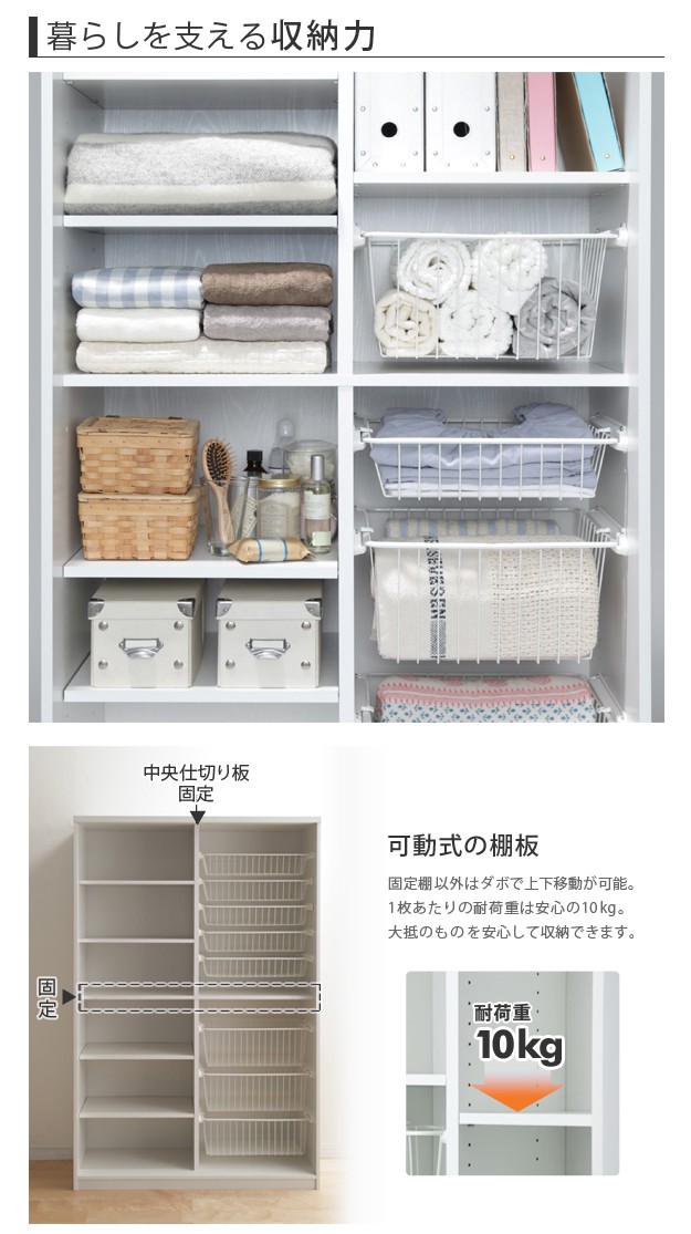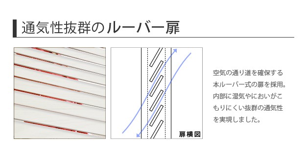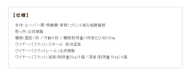 商品について:引き戸ルーバー扉のバスケット付き収納。引き戸タイプなので扉の開閉スペースがとれない場所にも設置OK。湿気がこもりにくく、通気性に優れたルーバー扉仕様。場所を選ばず様々な収納に対応します。可動棚と引出し式ワイヤーバスケットはレイアウト自在☆収納する物に合わせて位置や高さが調節できます。棚板(固定x1・可動x4)、バスケット(深x3・浅x5)