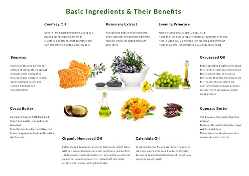 Evening Primrose Oil has healing nutrients,essential for cell structure & improving skin elasticity.Calendula Oil moisturizes soothing & reducing pain;speeds up healing of wounds,minor cuts.