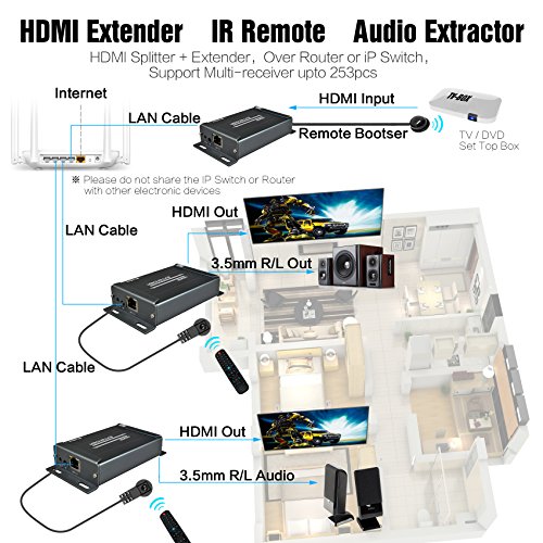 HDMI SPLITTER + EXTENDER, OVER ROUTER OR IP SWITCH, SUPPORT MULTI-RECEIVER UPTO 253pcs- The connection like: hdmi source---HSV891IR Sender---CAT5/5e/6/6e cable---switch---CAT5/5e/6/6e cable---Multi-HSV891 IR Receivers---Monitor, HDTV, Projector, or other HDMI screen.