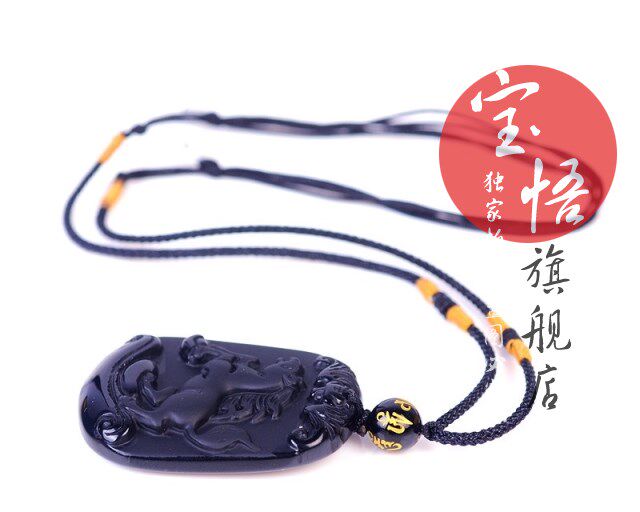 开光天然磨砂黑曜石神骏登峰吊坠项链