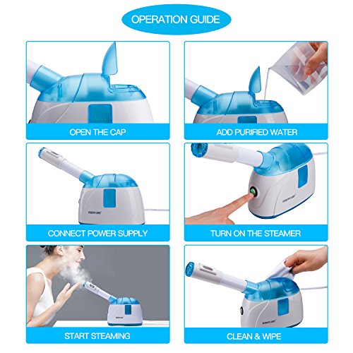 5.UNIQUE AND COMPACT DESIGN, IDEAL GIFT FOR FRIENDS: A full tank 240ml of water allows the cool mist last for 20-30 minutes which can provide you a comfortable face spa. Use the steamer with facial mark can get a better result for skin hydration. Select cool steam to relax skin, open/unclog pores to remove oil, dirt & grime, shrink pores for visibly tighter skin. It is suitable for all kinds of skin types. Perfect gift for yourself and your friends with a unique and compact design.