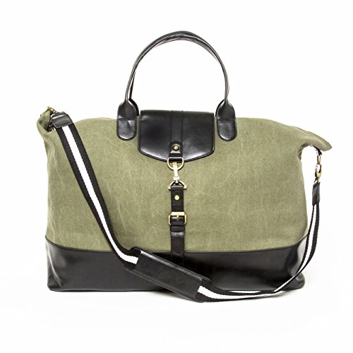 -. Feature : Tour large bag made from wax canvas material with vegan leather accents / Handsome vegan leather overflap with gold lock accents, which features a zippper enclosure to keep items secure / Interior striped lining with two open pockets and a zipper pocket to keep smaller items secure / 19.5" shoulder drop and removable straps / This perfect oversize bag for long weekends, overnight, daily-use, and traveling