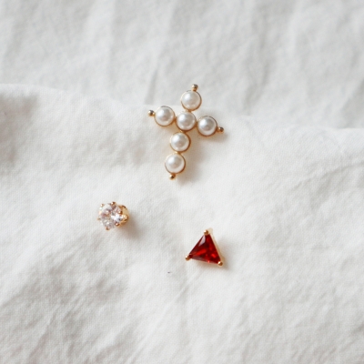 진주로 장식된 깨끗한 십자가와 빨간 세모큐빅, 베이직한 라운드 큐빅까지 세가지 타입의 귀걸이가 한세트 예요.