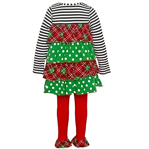 -. Feature : A joyful Christmas outfit from Bonnie Jean / Plaid and polka dotted ruffles and a striped upper part / Matching red leggings complete the set / Material: Top-Pant 95% Cotton, 5% Spandex, Exclusive of decoration. Care Instruction: Machine wash cold gentle cycle, with like colors wash inside out, do not bleach tumble dry low, remove promptly iron lowest setting as needed, iron on reverse side / Sizing is based on U.S. clothing size standards