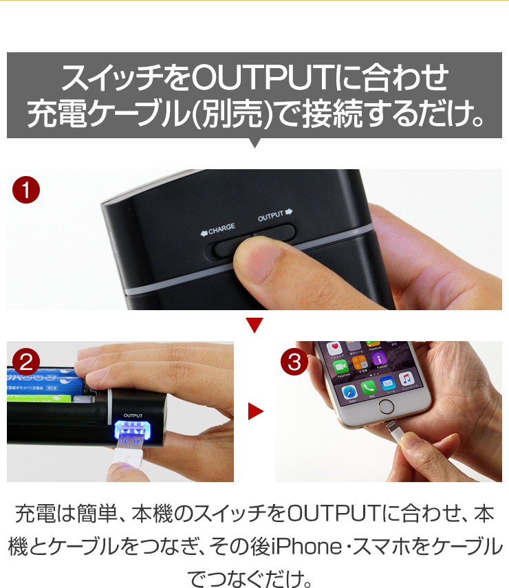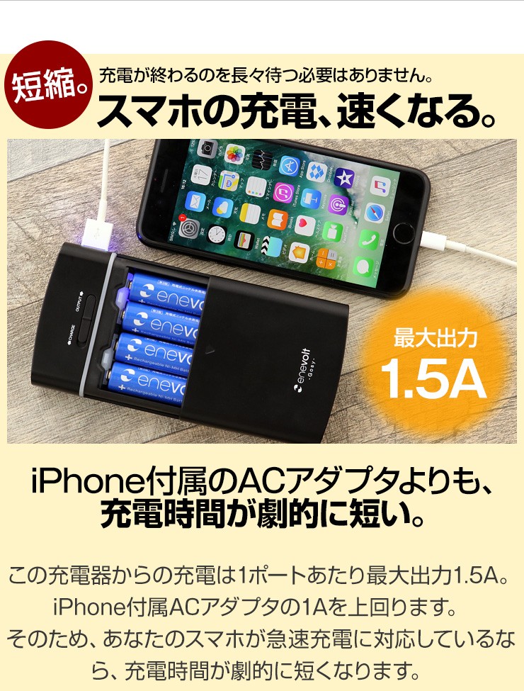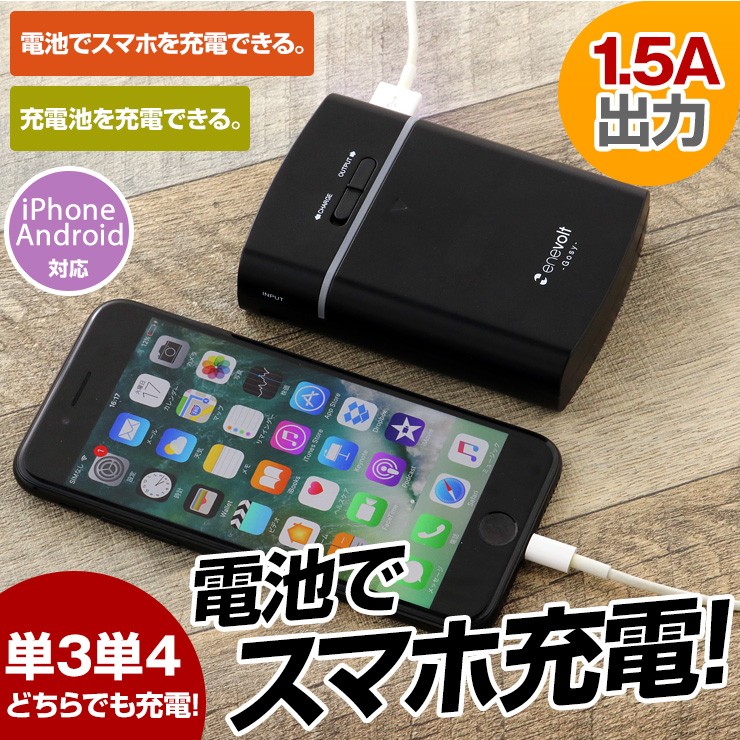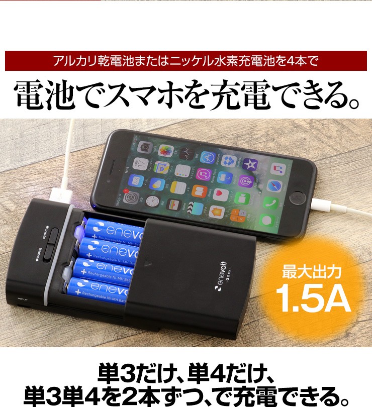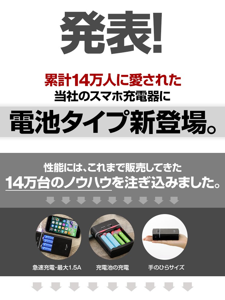 発表!累計14万人に愛された当社のスマホ充電器に、電池式タイプが新登場!【特徴】●アルカリ乾電池、ニッケル水素充電池4本でスマホが充電できます。●充電電流は最高1.5A。充電が速くなります。●ニッケル水素充電池を充電できます。●手のひらサイズで手軽に持ち運びができます。デジキン