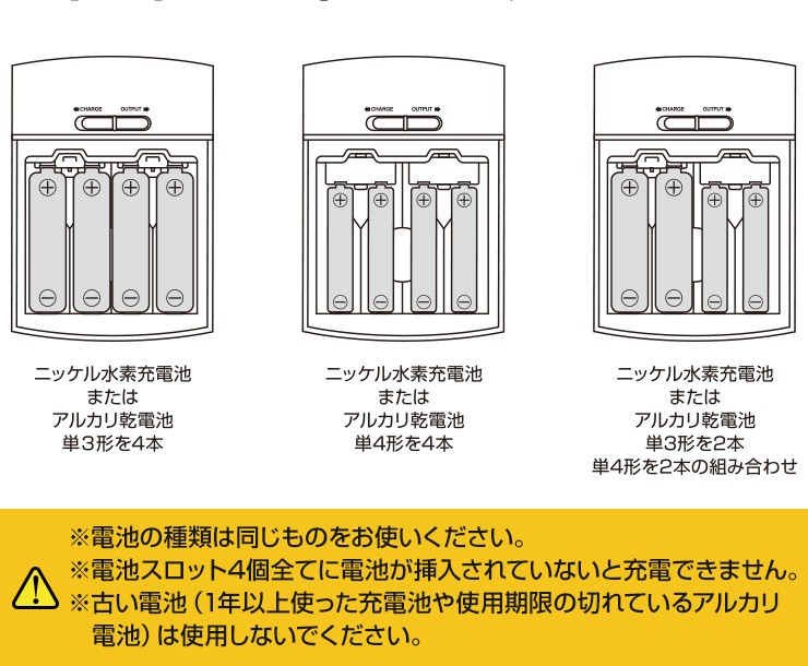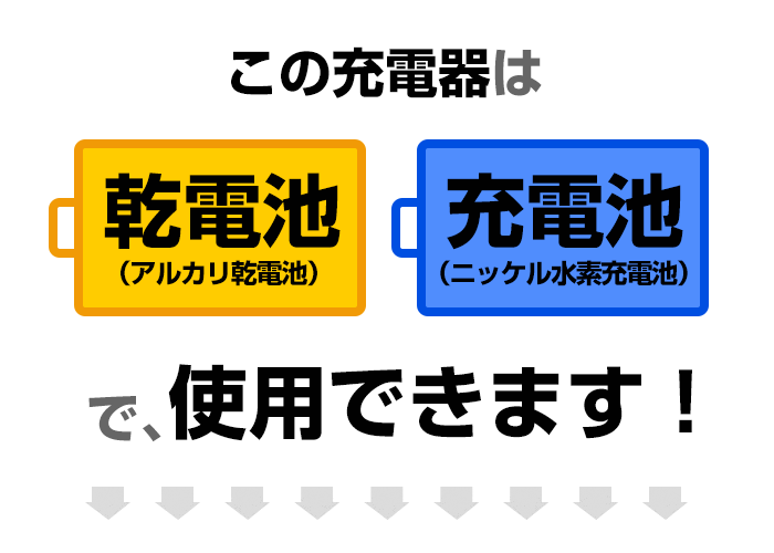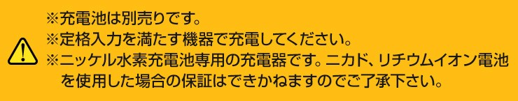 | ご注意事項 | ※電池の種類はすべて同じ種類の電池をご利用ください。 ※古い電池(一年以上使った充電池や使用期限の切れているアルカリ電池)は使用しないでください。 ※ニッカド電池には対応しておりません。 |