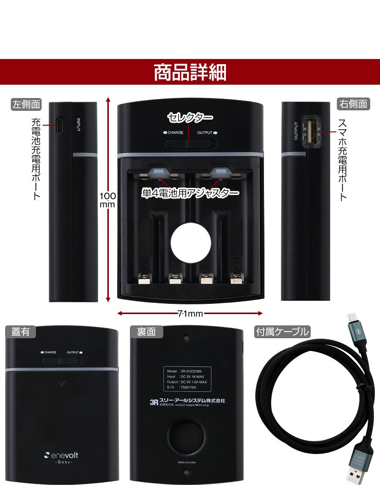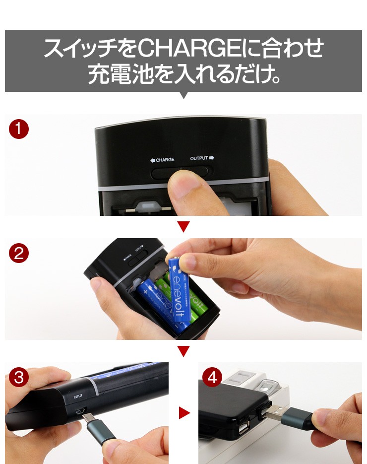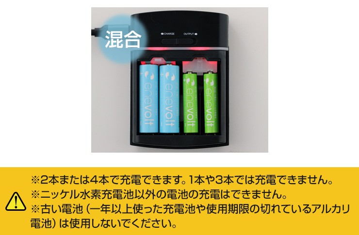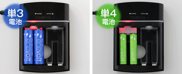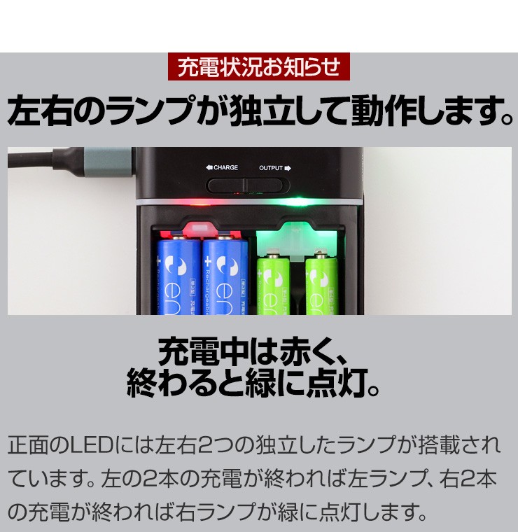| 対応電池 | ニッケル水素充電池(入力) ニッケル水素充電池 または アルカリ乾電池(出力) |