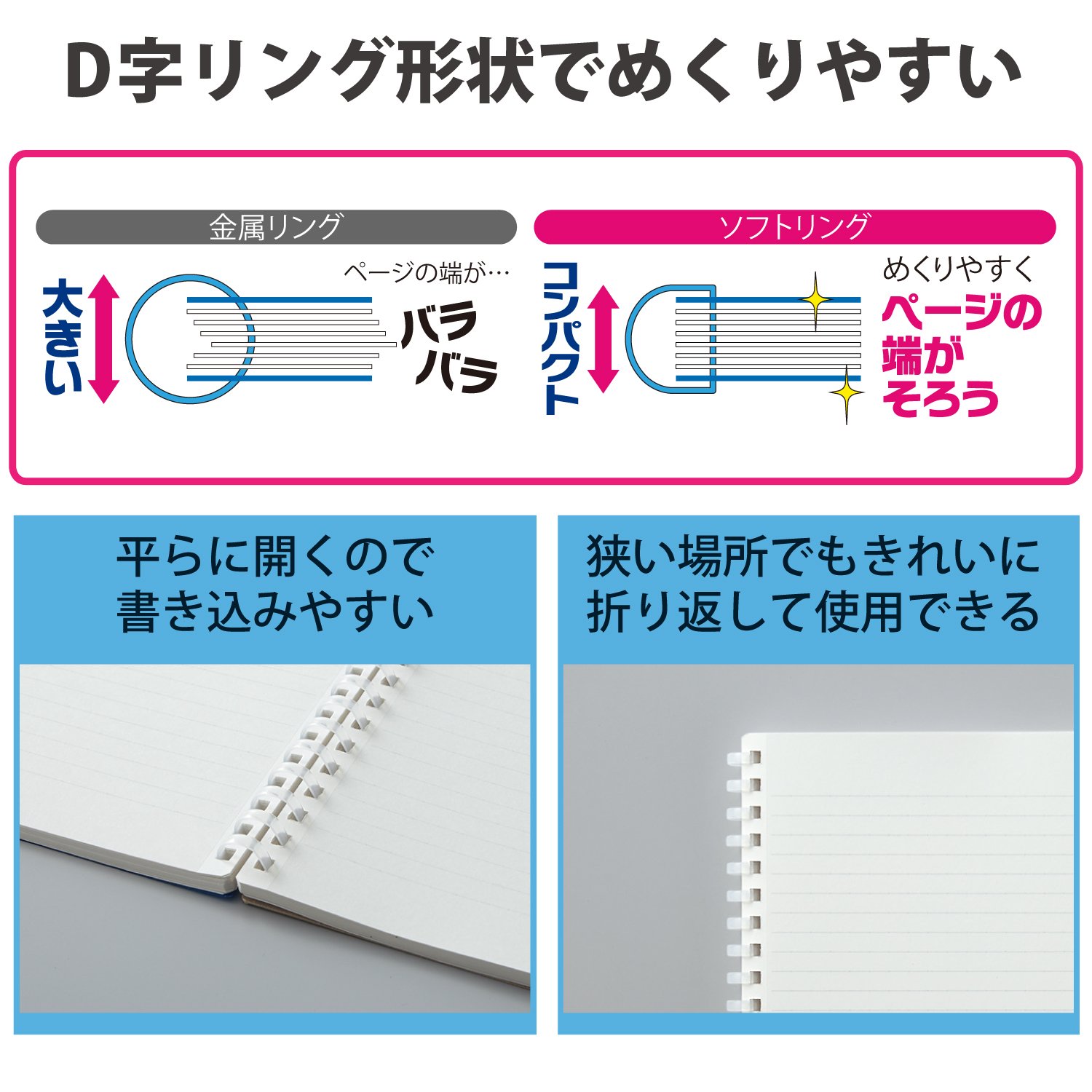 Since the shape of the ring is "D-shaped", the pages are easy to turn and the edges of the note pages are easier to align.