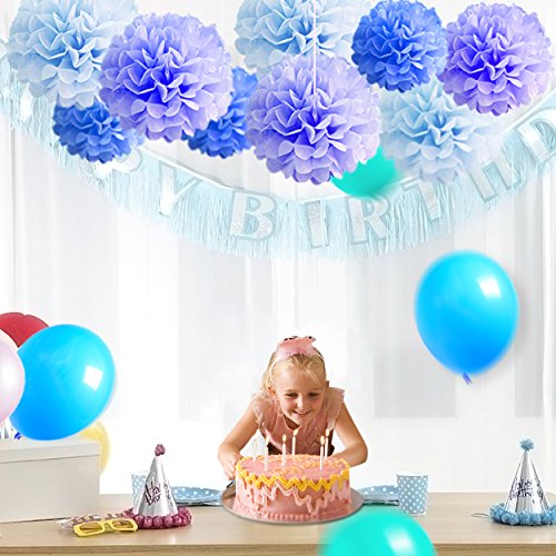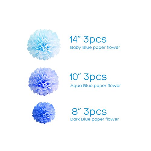 - PAPER POM POMS – 8 inches, 10 inches and 14 inches in size and color Dark Blue, Aqua Blue and Light Blue.