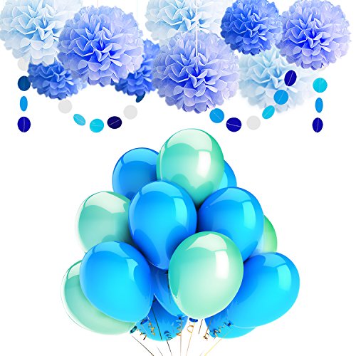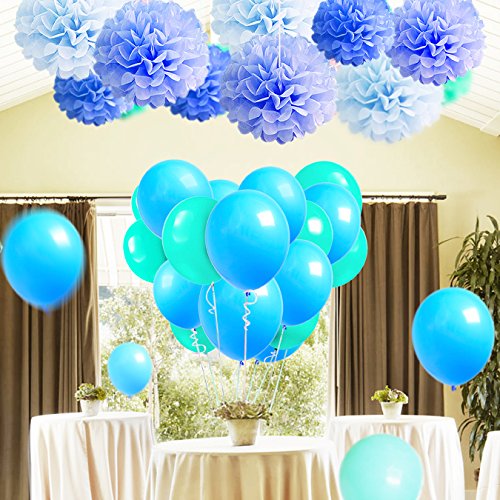Blue & Mint Party Balloons and Blue Paper Pom Poms for Baby Shower Party Decorations, (40 pcs )
