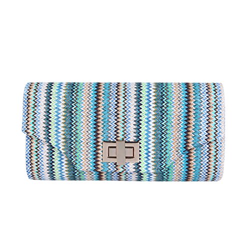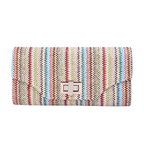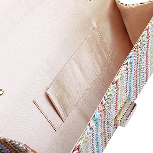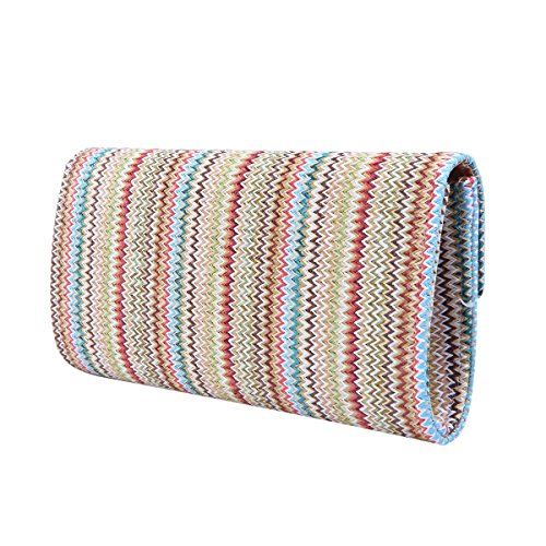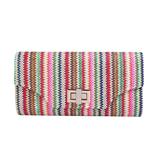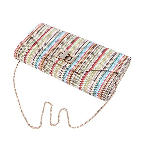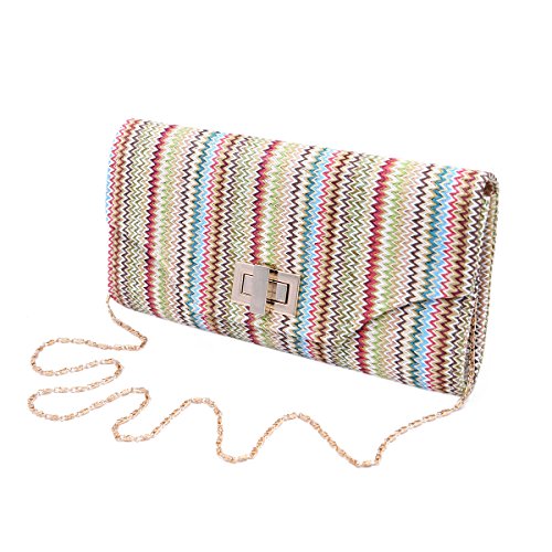 This premium quality clutch handbag is both elegant and stylish. Durable multi-color braided straw outer with classic chevron zig zag pattern, both chic and functional. Roomy enough to hold daily essentials. Fully lined with inner wall pocket and turnlock flap closure. Gold tone hardware. Removable hideaway shoulder chain strap with 21" drop. Unique and versatile. Perfect for both day and night use. Casual luxury at its best. A must have for all handbag lovers. The size is 11" (L) x 5.5" (H) x 2.5" (W).Feature