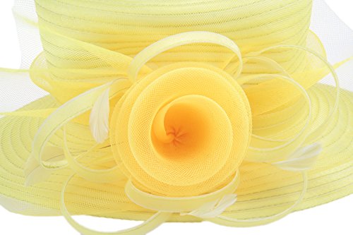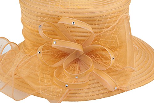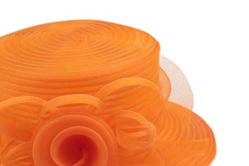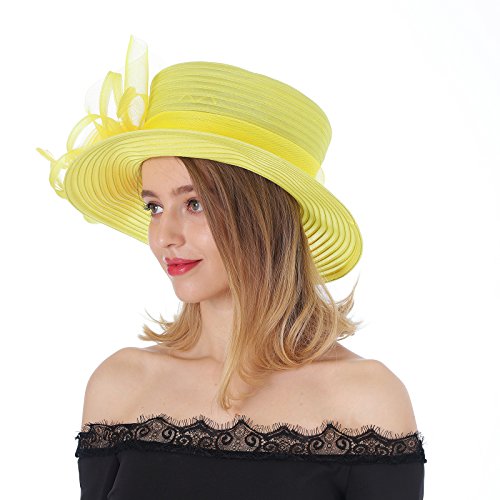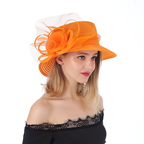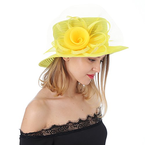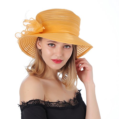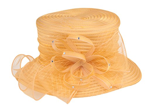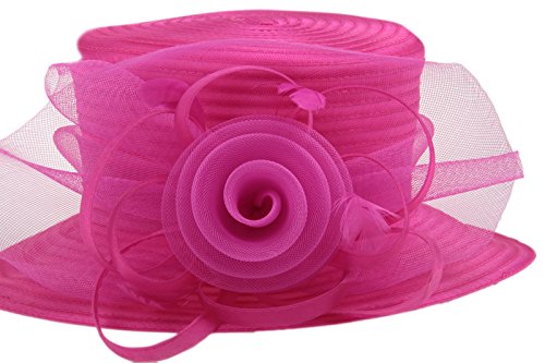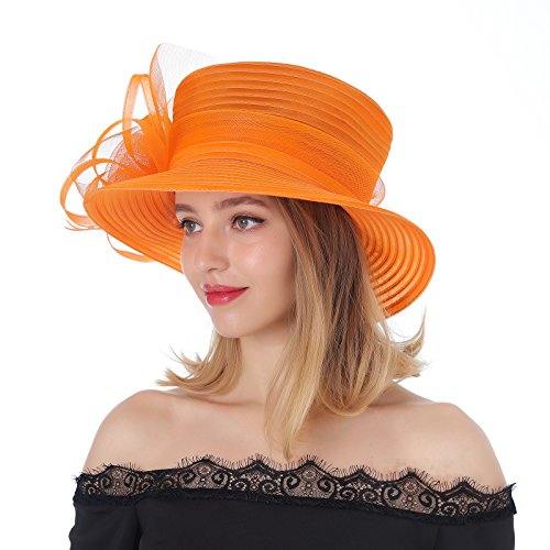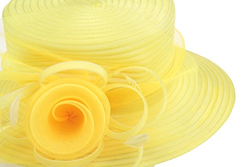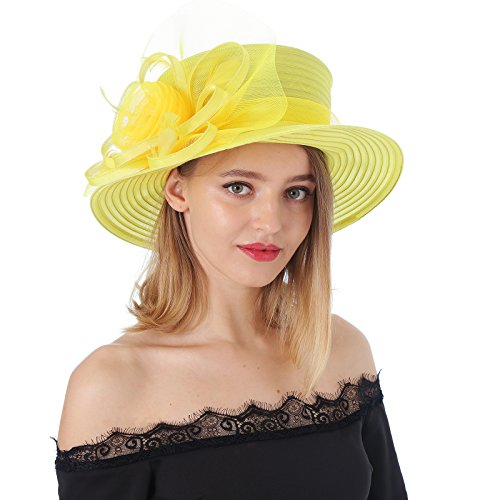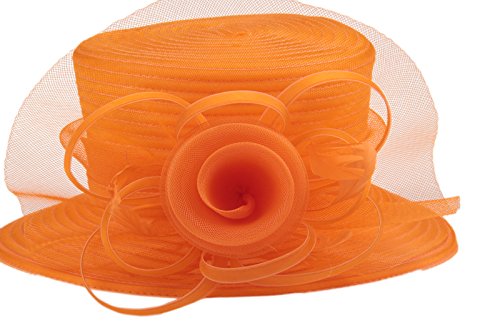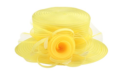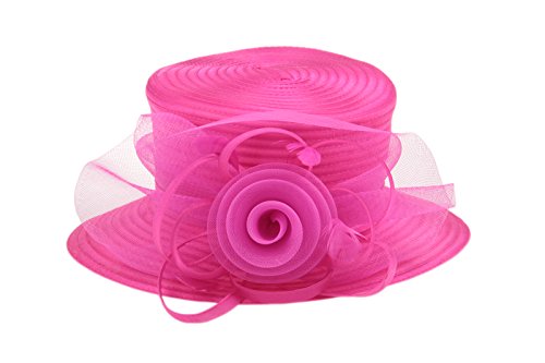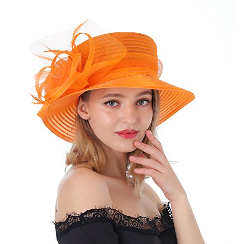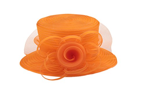 Whoever is on top of the winners board, you will be the focus of all attention in this charming organza derby hat. Its wide brim with a shimmering organza. that is the perfect accessory for any of those outdoor formal events those seasons usher in. The perfect hat for weddings, garden parties, church functions, race day events, or simply standing out from the crowd. Material: Stripe Organza 100% Polyester. Size: Fit for head circumference: 21.26 inch~22.83 inch. ,Inside drawstring can adjustable to size-fit to your head, (adjustive by flexible strap); Flat-size: Crown depth: 4.13 inch ,brim width: 2.95 inch Design: Simple Style, Flat brim decorate gauze and Floral. Color: Rose, Yellow, Orange, White Prompt: You can make it looks perfect by STEAM IRONING if you make it wrinkle. Wash care information: clean it with wet cloth gently. OCCASION Wear to Church, Twenty's Parties or Gatsby Picnics.Church hat, Wedding hat, Kentucky Derby hat cap, floral organza Hat, Lady hat, summer hat, beach travel hat. 0