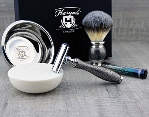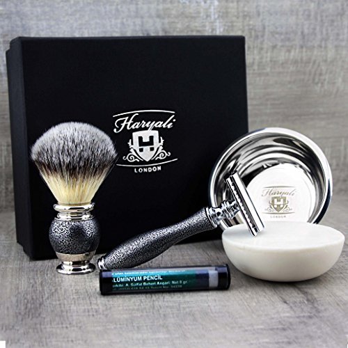 Vintage Look Men's Shaving Set >Eco Synthetic Brush, DE Safety (Blades NOT Included), Engraved Bowl & Soap| Gift for Him
