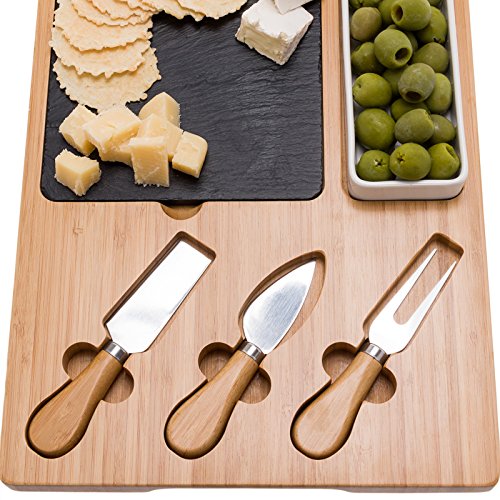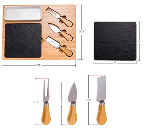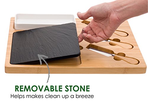 Studio : Mindful Design Publisher : Mindful Design Product Description Make creating and serving elegant appetizer, meat or cheese spreads easy with the Bamboo Charcuterie Board and 3 Piece Cutlery Set by Mindful Design. Each serving tray comes artfully crafted from eco-friendly bamboo, natural black slate, and stainless steel, for a striking yet food safe display platter. The removable 6" x 6" slate insert is perfect for holding any type of meat or cheese, and the porcelain tray keeps dips, olives, or other sides within reach. 3 stainless steel cheese knives come included, and fit snugly into special grooves in the board for storage.Easy grip handles on either side make trips from the kitchen effortless. Best of all, once the guests have left and the party has died down, clean up is simple - just wipe the board and all pieces down with water, and occasionally treat with oil for maintenance. Perfect for everyday use or large get-togethers, this stylish serving tray makes an ideal addition to any host or hostess' tool set! Measures 13" x 9.9". 0