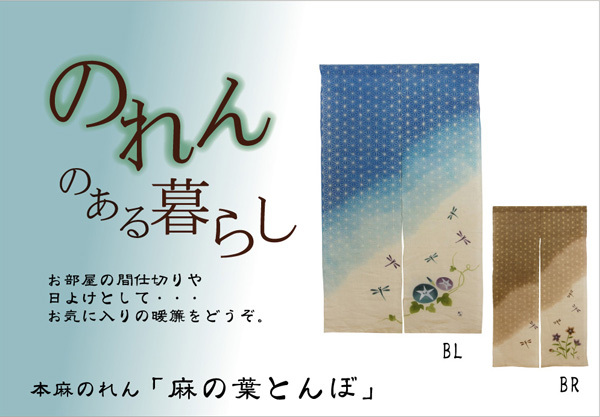 風物詩をあしらった麻暖簾です。強度に優れた麻生地を使用しています。程良い透け感のざっくりとした質感に仕上げました。また、通気性が良いので自然の空気を通します。生地は熟練の職人さんが手織りで仕上げております。手織り独特の温かみのある風合いをお楽しみ下さい。強い日差しを和らげる日よけとして、やわらかな目隠しに、間仕切りに、和の空間づくりになどご使用下さい。※のれん棒は付いておりません。