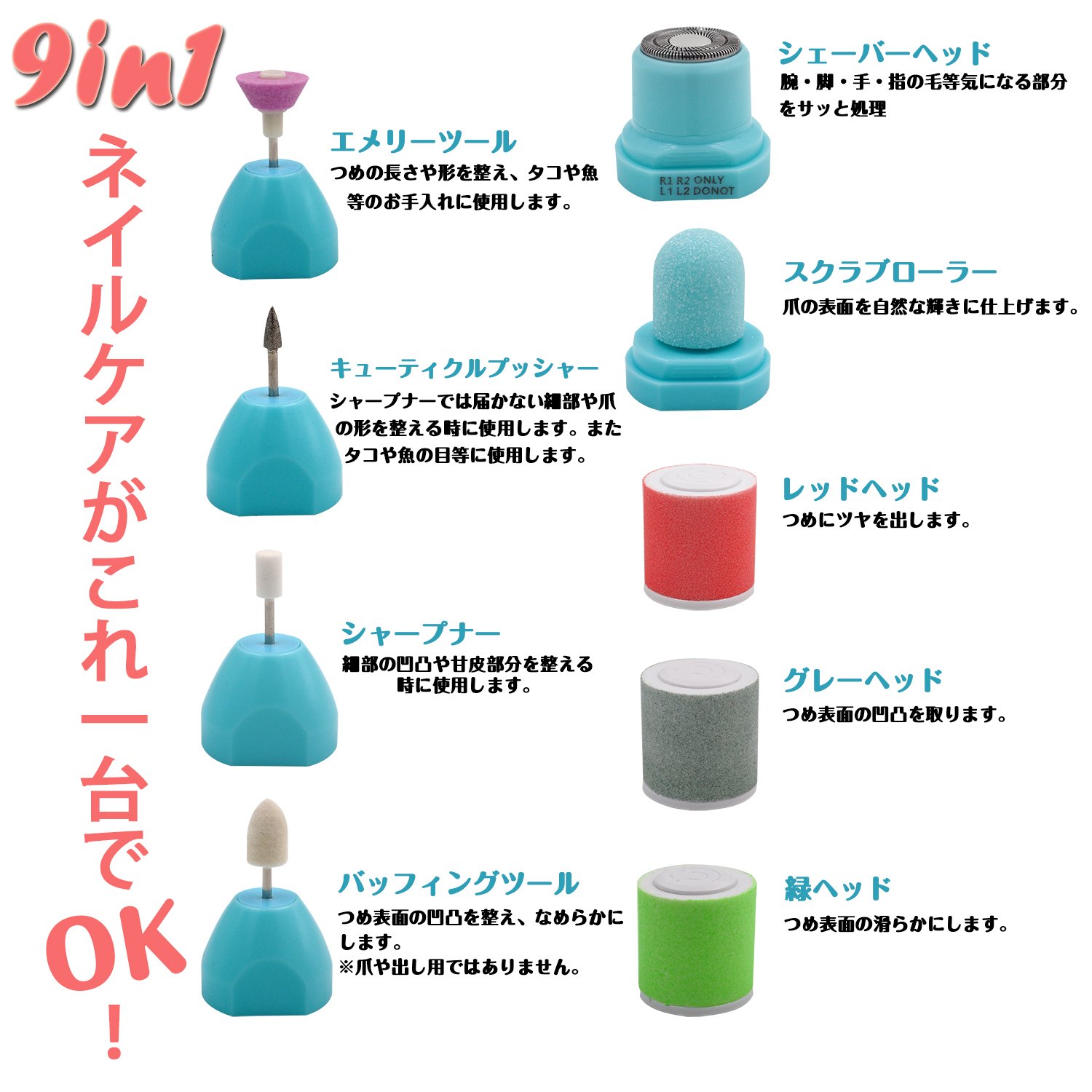 ● 9 types of attachments, which can be used appropriately according to uses and parts.