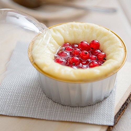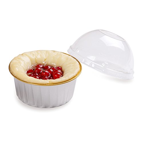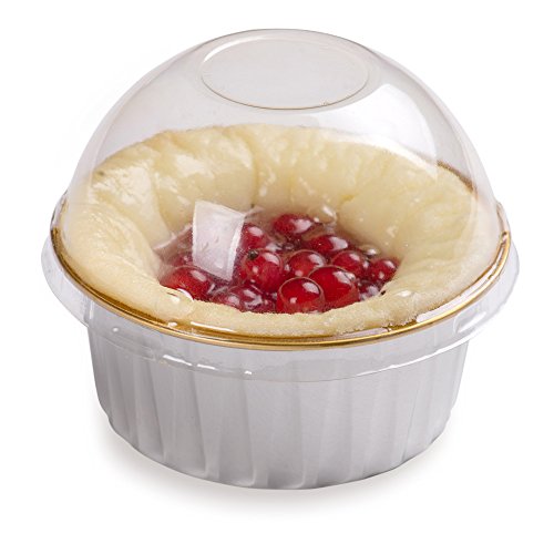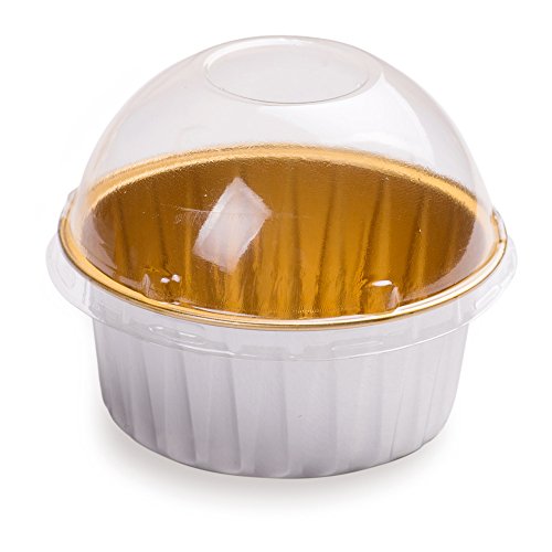 Premium 4.2-OZ Baking Cups with Lids – Round Foil Baking Cups & Lids Perfect for Fancy Desserts or Mini Snacks – Silver with Gold Liner Cup & Clear Lid – Oven & Freezer Safe – Recyclable – 100-CT