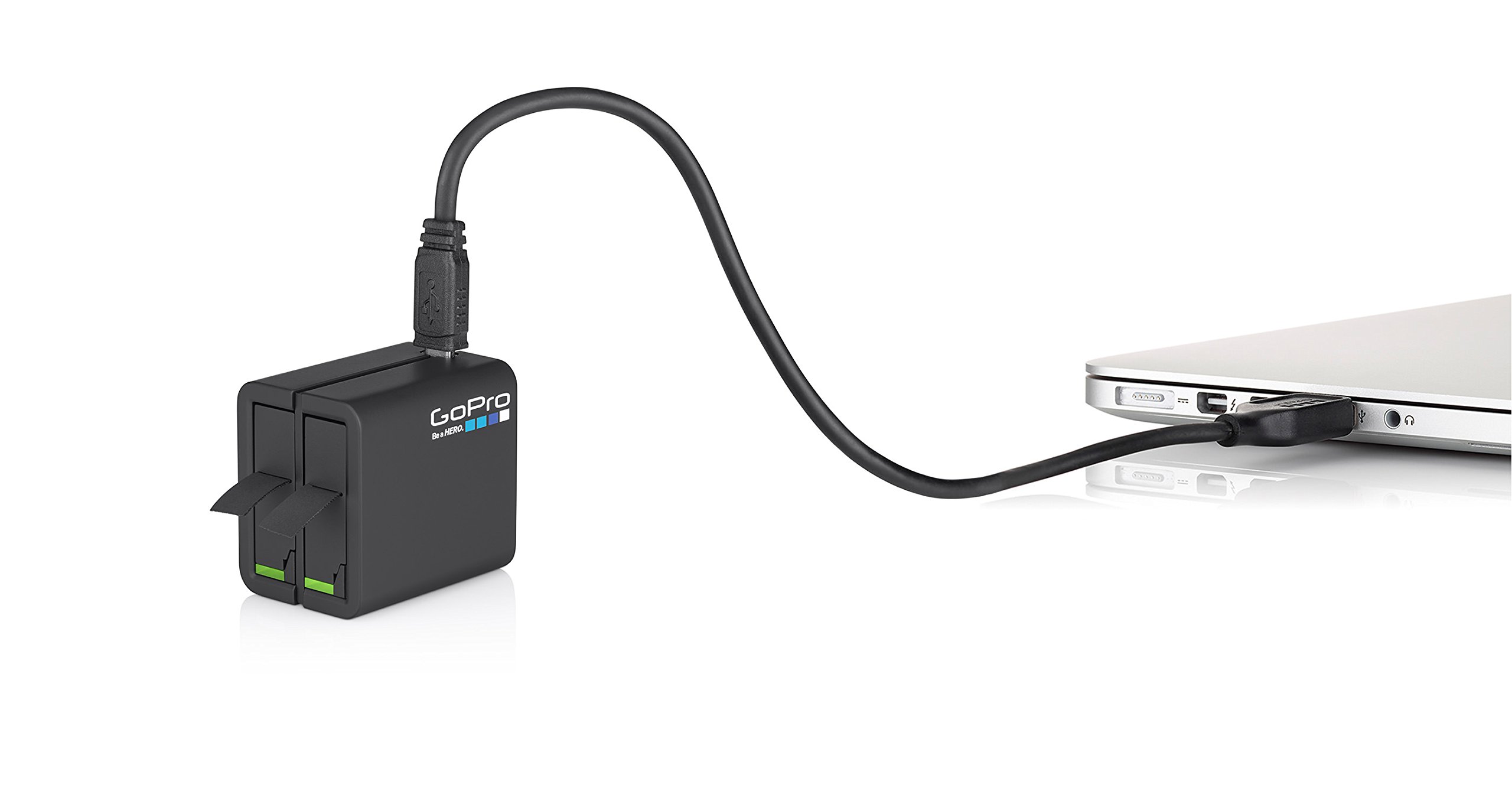 Let's charge the HERO 4 camera battery efficiently with a dual charger which is the only GoPro charger that can charge two HERO 4 batteries simultaneously.