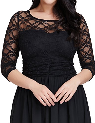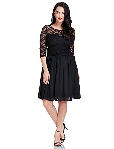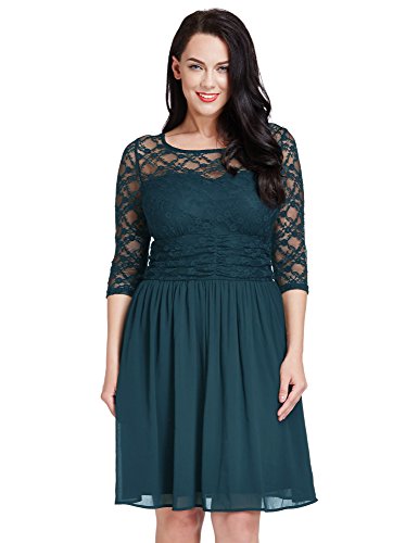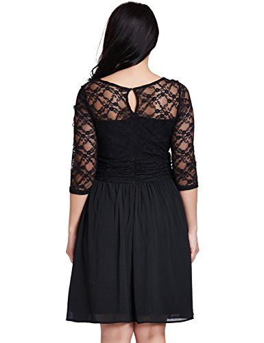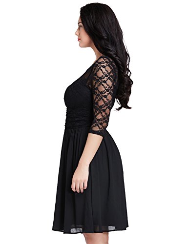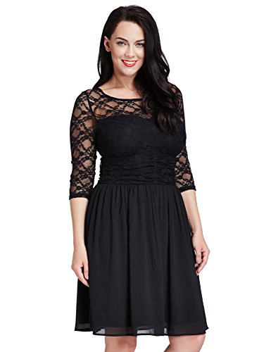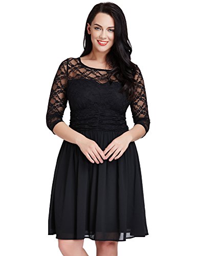 Made with stretchy lace top with flowy chiffon skater skirt. 3/4 sleeves. Lined.